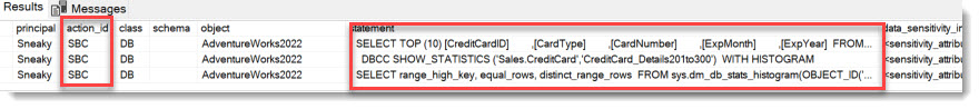 In Fact, the SENSITIVE_BATCH_COMPLETED_GROUP-Audit Action group captures all the 3 described methods to access the data: SELECT from table, DBCC SHOWSTATISTICS, SELECT from Dynamic Management Function, as we can see here: