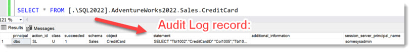 If we are auditing the Sales.CreditCard table, all we will see in the Audit log is the principal “somesysadmin”.