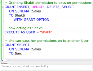 This is demoed by impersonating her account using the EXECUTE AS clause (btw: this is also an example of using delegation at the identity level) and now “being” Shakti we can grant permissions to anyone else, Jiao in this case.