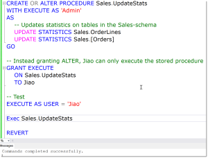 See the below example: ALTER is the minimal (“least”) permission necessary to Update Statistics on tables. But instead of granting ALTER on each table or the whole database, Jiao will only get permission to run this stored procedure which in turn runs under elevated permissions that are assumed for the runtime of the procedure only.